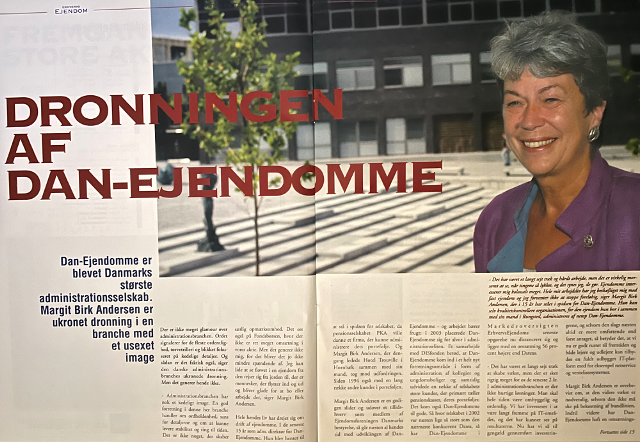 I 90erne var Margit Birk Andersen den eneste kvindelige direktør for et selskab, der ejede ejendomme. Men hun var ikke meget for at sige noget om det eller gøre væsen af det. Hun passede helst bare sit arbejde. Dengang var Dan-Ejendomme, senere Deas, – navnet er en sammentrækning af Danejendomme og Administrationsselskab, – både et administrationsselskab men samtidig ejede selskabet også en portefølje af ejendomme.