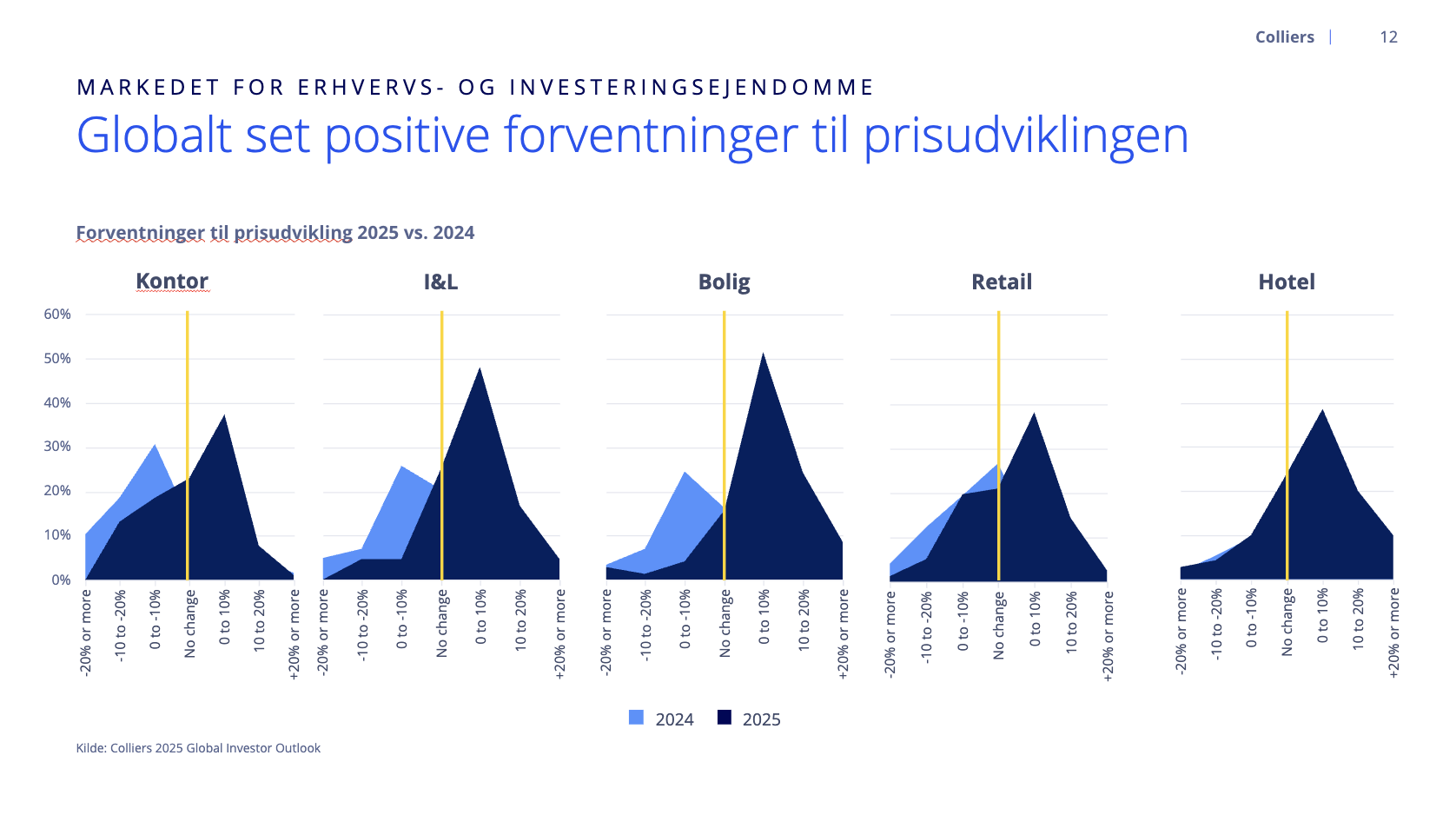 Colliers har spurgt over 1.000 investorer globalt, hvad de forventer af markedet i 2025, og her kan man, som grafikken nedenfor antyder, se, at investorerne forventer prisstigninger – også indenfor kontorsegmentet.