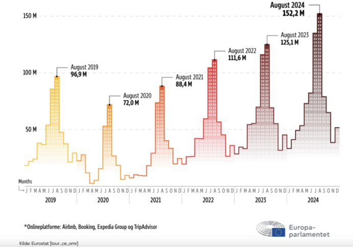 Det kulminerer i august måned, hvor danskerne er tilbage på job, og turisterne samtidig fylder i gaderne. Ikke så mærkeligt. I 2024 satte antallet af korttidsudlejninger i EU rekord med 854 millioner.