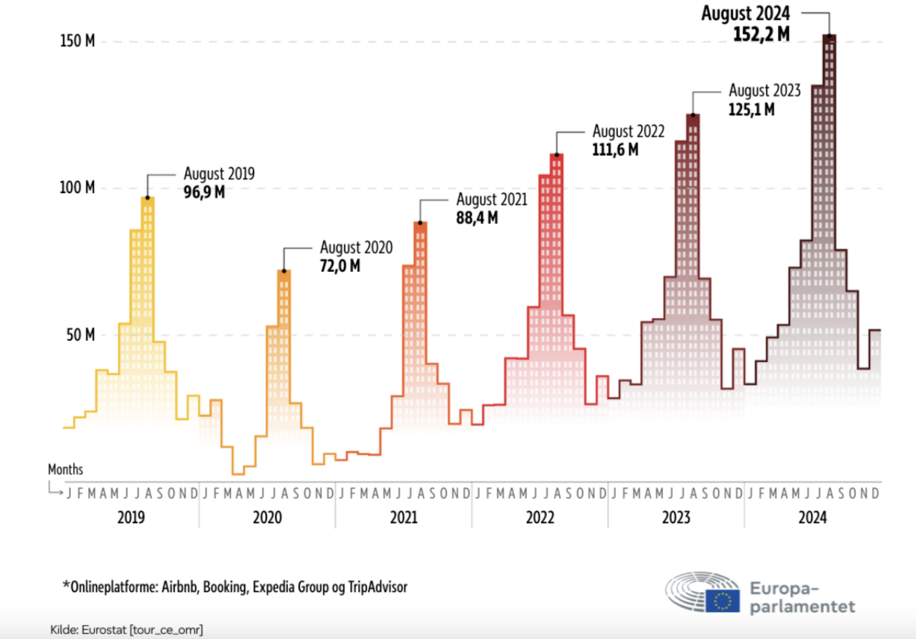 I 2024 blev der i alt booket 854 millioner overnatninger i EU via fire store onlineplatforme, Airbnb, Booking, Expedia Group og Tripadvisor. Det svarer til en stigning på hele 18,8 procent i forhold til 2023, hvor der var 719 millioner overnatninger. Det er dermed ny rekord.
